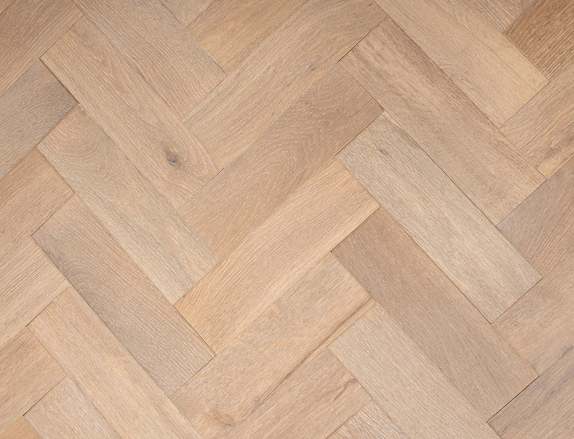 Premium Canopy Hainault engineered oak flooring with brushed surface and UV oiled finish. Durable herringbone design suitable for underfloor heating.