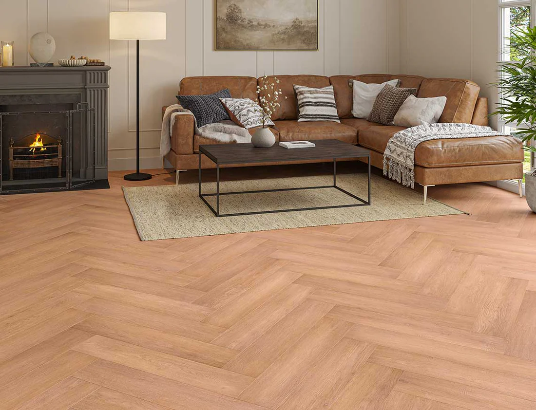 The Canopy Hamilton Max 3mm Warm Hearth Herringbone LVT brings timeless elegance with a warm wood tone and classic herringbone design.